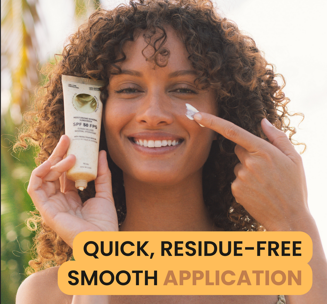 ✔ Broad-spectrum UVA & UVB mineral filters without nanoparticles protect without harming marine life. Organic oils and butters moisturize and nourish the skin.